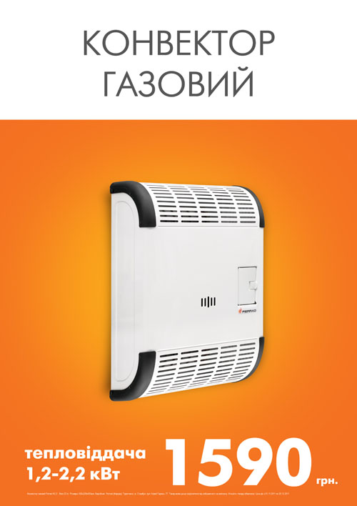 Для быстрого равномерного отопления помещение в холодное время года рекомендуем Вам обратить внимание на газовый конвектор. Этот экономичный, безопасный отопительный прибор поможет в считанные минуты обогреть помещение. Только сейчас и только в сети гипермаркетов «Новая Линия» у Вас есть возможность приобрести высококачественный газовый конвектор по суперцене - всего 1590 грн. Газовый конвектор обеспечивает быстрое, безопасное и рачительное отопление жилых, общественных и производственных помещений. Использование газовых конвекторов позволяет осуществлять независимое отопление отдельных помещений. Простота управления обеспечивается пьезоэлектрическим зажиганием — прибор зажигается простым нажатием кнопки. Температура регулируется индивидуально, энергосберегающая автоматика обеспечивает контроль за равномерным распределением тепла. Газовые конвекторы абсолютно независимы от электросети, что позволяет использовать их даже там где нет электричества. Так же есть модели с встроенным тангенциальным вентилятором, увеличивающий конвекцию. Данные обогреватели— это воздухонагреватели конвекционного типа, которые идеально подходят для обогрева любых неотапливаемых помещений: прихожих, лестничных площадок, чердачных помещений, лекционных залов, оранжерей. Они являются экономичной и эффективной альтернативой другим видам отопления, а также могут дополнить уже существующую систему центрального отопления. Основные преимущества газового конвектора: Обогреватели легко включаются даже при отрицательных температурах; Отсутствие теплоносителя (воды) — гарантия от замерзания системы; Плавная регулировка комнатной температуры от 13 до 38°С; Герметичная камера сгорания с прямым забором воздуха и выбросом продуктов сгорания газа за пределы помещения; Чугунный теплообменник; Большая производительность благодаря большей нагревательной поверхности при тех же размерах; Продолжительный срок службы; Малый расход газа и бесшумность работы; Газовая горелка из нержавеющей стали; Пьезорозжиг (не требующее подключение к сети); Датчик пламени — автоматически прекращает подачу газа при отсутствии пламени. Небольшое инспекционное окошко позволяет контролировать работу обогревателя; Наличие электромагнитного клапана двойного действия с регулятором давления на подаче газа; Наличие комнатного датчика регулятора температуры; Некоторые модели с встроенным тангенциальным вентилятором, увеличивающий конвекцию; Все модели поставляются настроенными на работу на природном газе. Возможна перенастройка на сжиженный газ. Переходной комплект для работы на сжиженном газе поставляется отдельно; «Новая Линия»! Все для Вашего дома и ремонта!